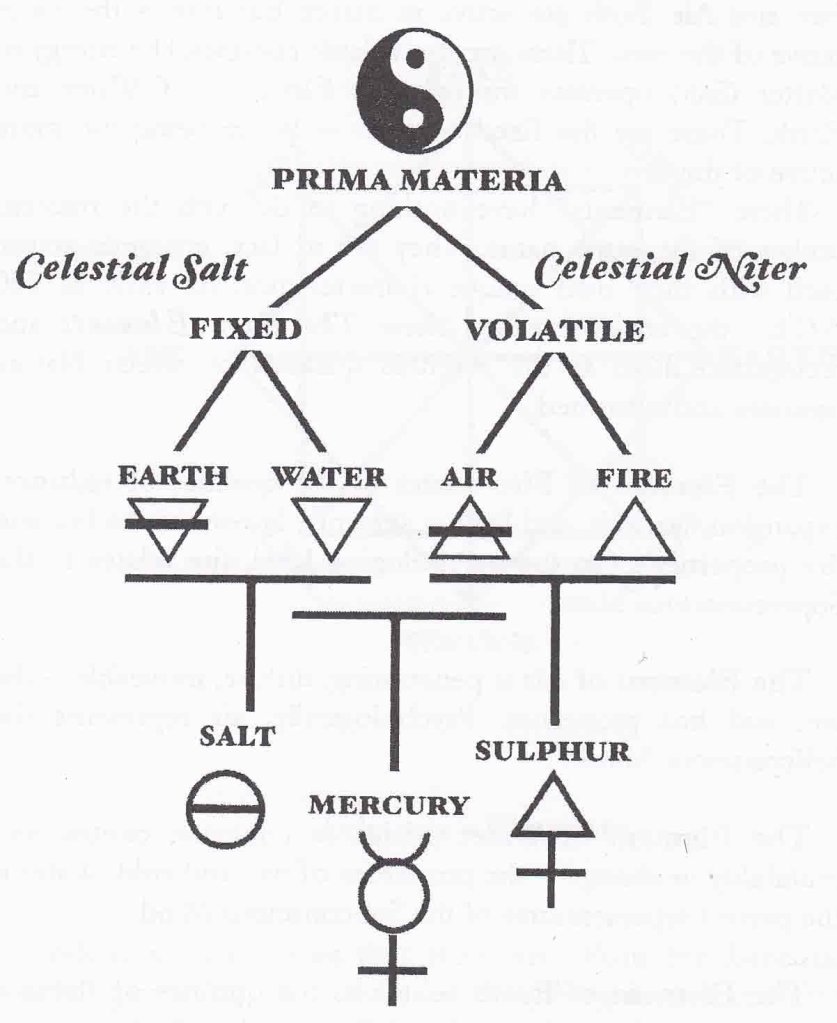 🌨️ O enxofre, a energia masculina e fixa, ativa, queima e corrói. O mercúrio, a energia feminina, volátil, passiva, inerte. O sal une ambos, rei e rainha, a energia vital que une corpo e alma.