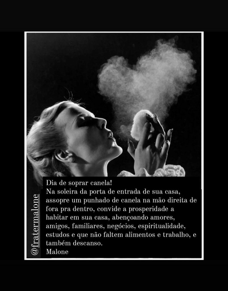 Na soleira da porta de entrada de sua casa, assopre um punhado de canela na mão direita de fora pra dentro, convide a prosperidade a habitar em sua casa, abençoando amores, amigos, familiares, negócios, espiritualidade, estudos e que não faltem alimentos e trabalho, e também descanso.