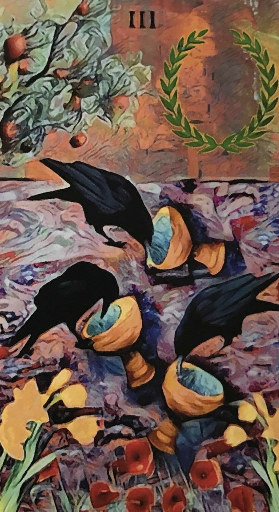 O três de copas é a manifestação emocional, em sua forma concreta, em que aprendemos pela via emocional a trazer à realidade o que nos permeia as águas internas.