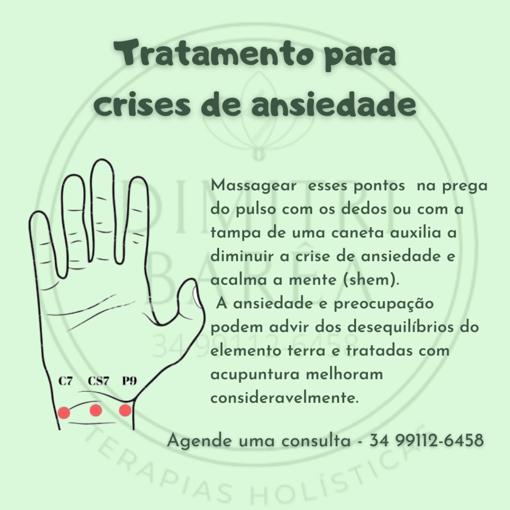 Massagear esses pontos na prega do pulso com os dedos ou com a tampa de uma caneta auxilia a diminuir a crise de ansiedade e acalma a mente (shem).